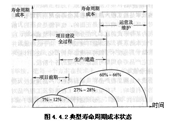 工程壽命周期成本是工程設計、開發(fā)、建造、使用、維修和報廢等過程中發(fā)生的費用,也即該項工程在其確定的壽命周期內(nèi)或在預定的有效期內(nèi)所需支付的研究開發(fā)費、施工安裝費、運行維修費、報廢回收費等費用的總和。不同階段壽命周期成本的構成情況如圖4.4.2所示。對于不同的工程項目,圖4.4.2中的數(shù)據(jù)可能有所不同,而且在一般情況下,運營及維護成本往往大于項目建設的一次性投入。因此,在分析壽命周期成本時,首先要明確壽命周期成本所包括的費用項目,也就是必須建立壽命周期成本的構成體系。無論選擇什么樣的結構,計算壽命周期成本時都不應遺漏重要的項目,也不能有重復項目。明確各項費用的內(nèi)容和范圍,以及他們在費用構成體系中的相互關系是十分重要的。