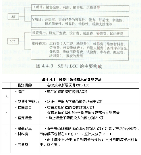 投資的目的是多種多樣的,當計算費用效率CE時,哪些應作為投資所得的“成果”計人系統(tǒng)效率SE(分子要素),哪些應計人壽命周期成本LCC(分母要素),有時是難以區(qū)分的。因此,可采用如下方式加以區(qū)分:①列出費用效率(CE)式中分子、分母所包含的各主要項目(如圖4.4.3所示);②列出投資目的:增產(chǎn),維持生產(chǎn)能力,提高質(zhì)量,穩(wěn)定質(zhì)量,降低成本(材料費、勞務費)等,見表4.4.1。76YU5