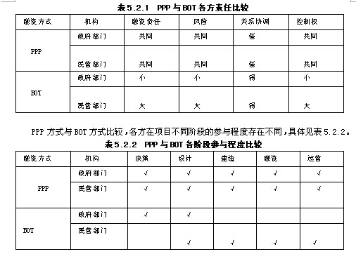 PPP方式與BOT方式在各方責任方面有著較為明顯的不同,總的來說,BOT項目中政府與民營企業缺乏恰當的協調機制,導致雙方自身目標不同,出現利益沖突,而PPP融資方式中政府與民營部門的關系更加緊密,具體比較見表5.2.1。