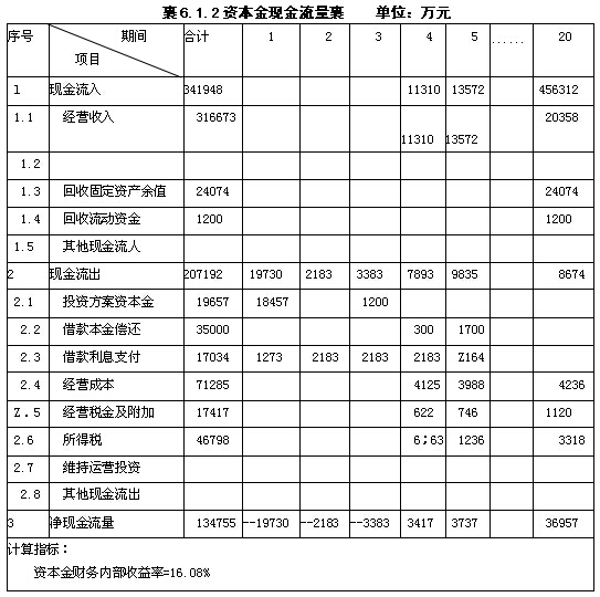 資本金現(xiàn)金流量表是從投資方案權(quán)益投資者整體(即項(xiàng)目法人)角度出發(fā),以投資方案資本金作為計(jì)算的基礎(chǔ),把借款本金償還和利息支付作為現(xiàn)金流出,用以計(jì)算資本金財(cái)務(wù)內(nèi)部收益率,反映在一定融資方案下投資者權(quán)益投資的獲利能力,用以比選融資方案為投資者投資決策、融資決策提供依據(jù)。資本金現(xiàn)金流量表構(gòu)成見表6.1.2(舉例)。