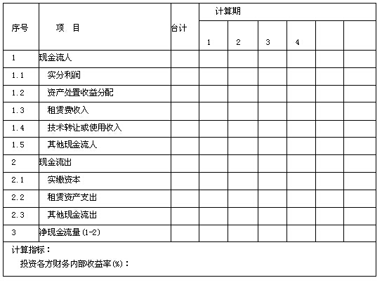 投資各方現(xiàn)金流量表是分別從投資方案各個(gè)投資者的角度出發(fā),以投資者的出資額作為計(jì)算的基礎(chǔ),用以計(jì)算投資方案投資各方財(cái)務(wù)內(nèi)部收益率。投資各方現(xiàn)金流量表構(gòu)成見表6.1.3。一般情況下,投資方案投資各方按股本比例分配利潤(rùn)和分擔(dān)虧損及風(fēng)險(xiǎn),因此,投資各方的利益一般是均等的,沒有必要計(jì)算投資各方的財(cái)務(wù)內(nèi)部收益率。只有投資方案投資者中各方有股權(quán)之外的不對(duì)等的利益分配時(shí)(契約式的合作企業(yè)常常會(huì)有這種情況),投資各方的收益率才會(huì)有差異,此時(shí)常常需要計(jì)算投資各方的財(cái)務(wù)內(nèi)部收益率,以看出各方收益是否均衡,或者其非均衡性是否在一個(gè)合理的水平,有助于促成投資方案投資各方在合作談判中達(dá)成平等互利的協(xié)議。