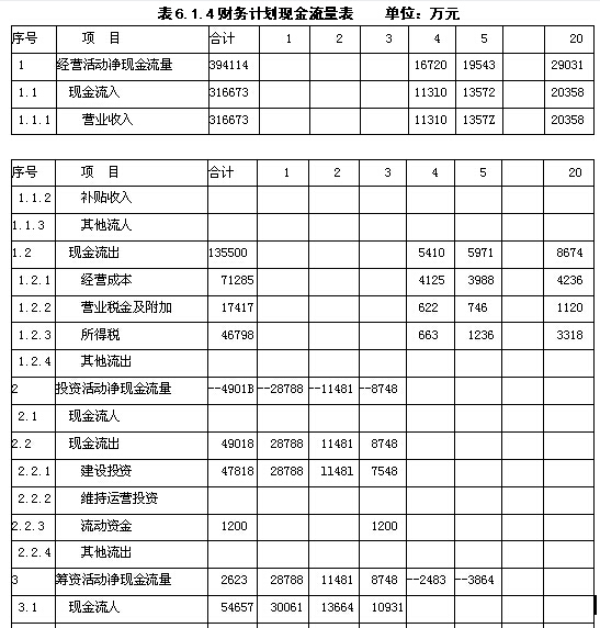 財(cái)務(wù)計(jì)劃現(xiàn)金流量表反映投資方案計(jì)算期各年的投資、融資及經(jīng)營(yíng)活動(dòng)的現(xiàn)金流人和流出,用于計(jì)算累計(jì)盈余資金,分析投資方案的財(cái)務(wù)生存能力。財(cái)務(wù)計(jì)劃現(xiàn)金流量表構(gòu)成見表6.1.4(舉例)。