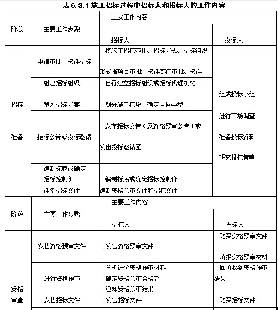 施工招標過程中招標人和投標人的工作內容見表6.3.1。