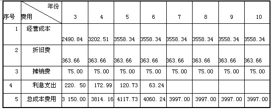 (5)第7、第8、第9年和第10年已還清貸款,所以,總成本費用表中,不再有固定資產貸款利息,總成本均為3997萬元;利潤與利潤分配表中用于還款的未分配利潤也均為0;凈利潤只用于提取盈余公積金10%和應付投資者各方股利50%,剩余的未分配利潤轉下年期初未分配利潤。