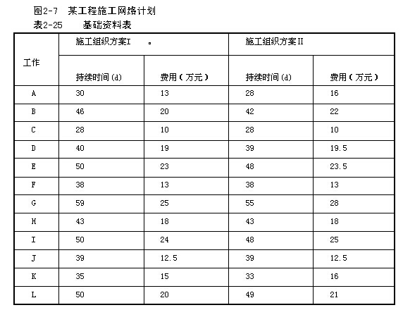 根據工作之間的邏輯關系,某工程施工網絡計劃如圖2-7所示。該工程有兩個施工組織方案,相應的各工作所需的持續時間和費用見表2-25。在施工合同中約定:合同工期為27 1天,實際工期每拖延1天,逾期違約金為0.5萬元;實際工期每提前1天,提前工期獎為0.5萬元。