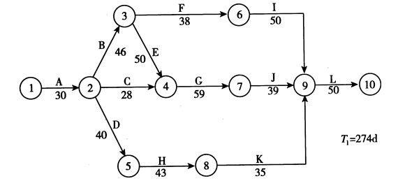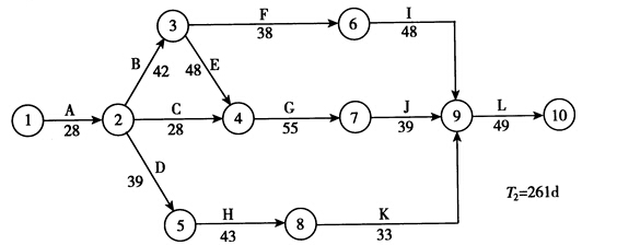 即關鍵工作A、B、E、G、J、L執行方案Ⅱ的工作時間,保證工期為261d;非關鍵工作執行方案I的工作時間,而其中費用較低的非關鍵工作有:孟D =40d,cD=19萬元;t1=50d,ci=24萬元;參K=35d,CK=15萬元。則,按此方案混合組織施工的綜合費用為:
