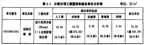 2.編制花崗石墻面工程的工程量清單綜合單價分析表,列式計算并把計算結(jié)果填入答題紙表1.1中。
