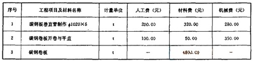 2.按照以下規定:碳鋼板卷管安裝的損耗率為4%。每制作1t的板卷管直管工程量耗用鋼板材料1.05t;鋼卷板開卷與平直的施工損耗率為3%;