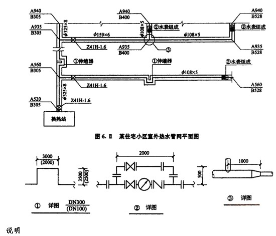 1.本圖所示為某住宅小區室外熱水管網平面布置圖.該管道系統工作壓力為1.0MPa.熱水溫度為95℃.圖中平面尺寸均以相對坐標標注.單位以m計,詳圖尺寸以mm計。