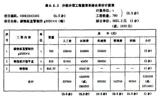 (4)承包人應該向發包方計取的該項鋼板卷管制作分部分項工程量清單費用數額。依據《建設工程工程量清單計價規范》《全國統一安裝工程預算定額》的有關的規定,計算出Φ1020×6碳鋼板直管制作(清單項目的統一編碼為030613001)的分部分項工程量清單綜合單價,將相關數據填入答題紙表