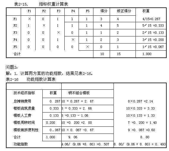 2.若以樓板工程的單方模板費用作為成本比較對象,試用價值指數法選擇較經濟的模板體系(功能指數、成本指數、價值指數的計算結果均保留三位小數)。