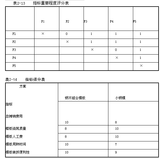 承包商B在某高層住宅樓的現澆樓板施工中,擬采用鋼木組合模板體系或小鋼模體系施工。經有關老師討論,決定從模板總攤銷費用(F1)、樓板澆筑質量(F2)、模板人工費(F3)、模板周轉時間(F4)、模板裝拆便利性(F5)五個技術經濟指標對該兩個方案進行評價,并采用0--1評分法對各技術經濟指標的重要程度進行評分,其部分結果見表2-13,兩方案各技術經濟指標的得分見表2-14。
