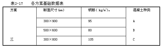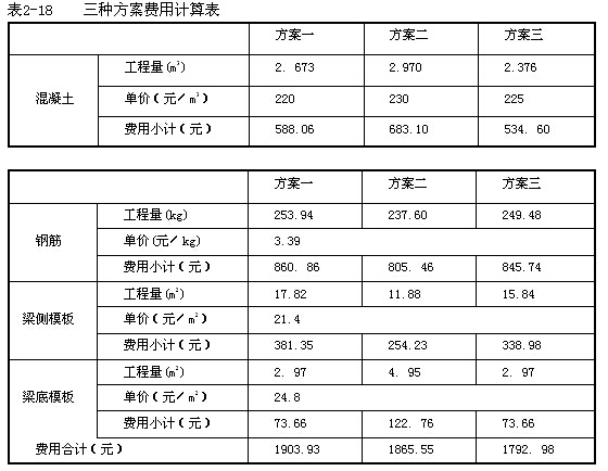 3.假設該工程的一根9.9m長的現澆鋼筋混凝土梁可采用三種設計方案,其斷面尺寸均滿足強度要求。該三種方案分別采用A、B、C三種不同的現場制作混凝土,有關數據見表2-170經測算,現場制作混凝土所需費用如下:A種混凝土為220元/m3,B種混凝土為230元/m3,C種混凝土為225元/m3 0另外,梁側模21.4元/m2,梁底模24.8元/m2;鋼筋及制作、綁扎為3390元/t。