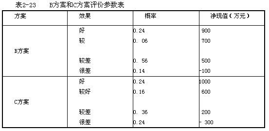 通過對B方案和C方案的投資額數額及發生概率、年凈收益額數額及發生概率的分析,得到該兩方案的投資效果、發生概率及相應的凈現值數據,見表2-23。