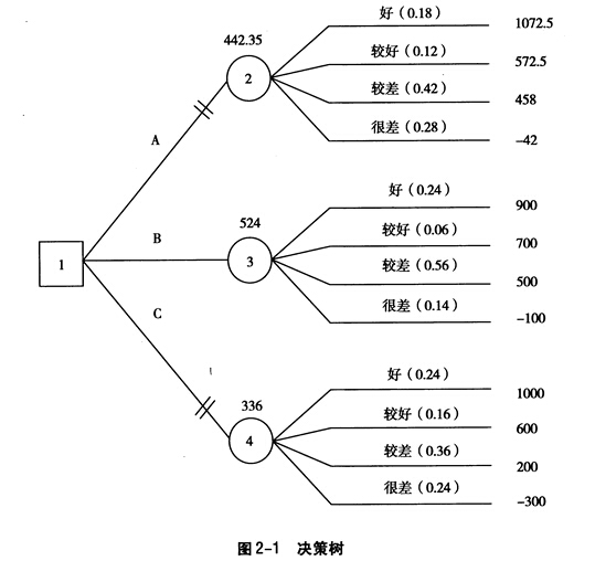 決策樹的繪制是自左向右(決策點和機會點的編號左小右大,上小下大),而計算則是自右向左。各機會點的期望值計算結果應標在該機會點上方,最后將決策方案以外的方案枝用兩短線排除。