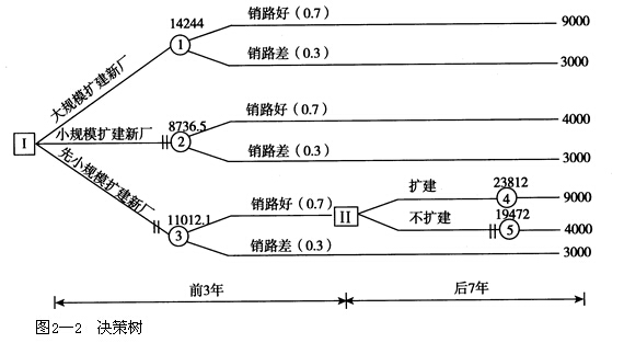 解:根據背景資料所給出的條件畫出決策樹,標明各方案的概率和凈現金流量,如圖2-2所示。