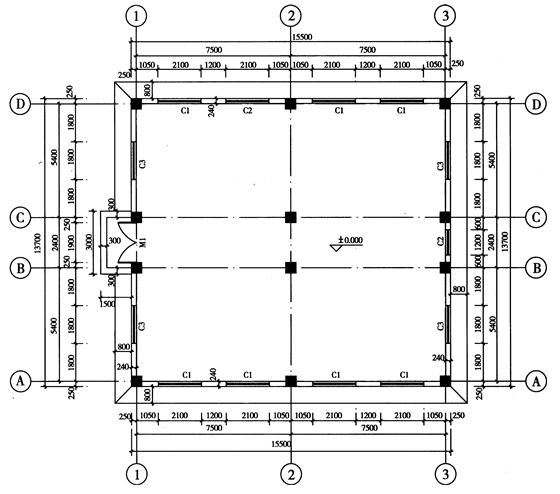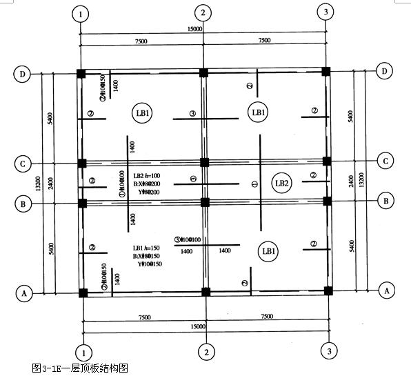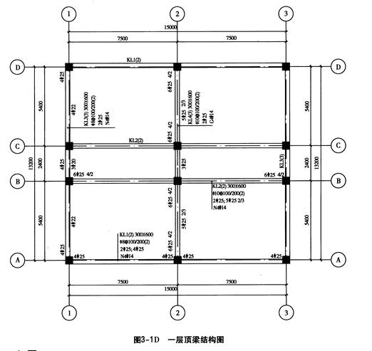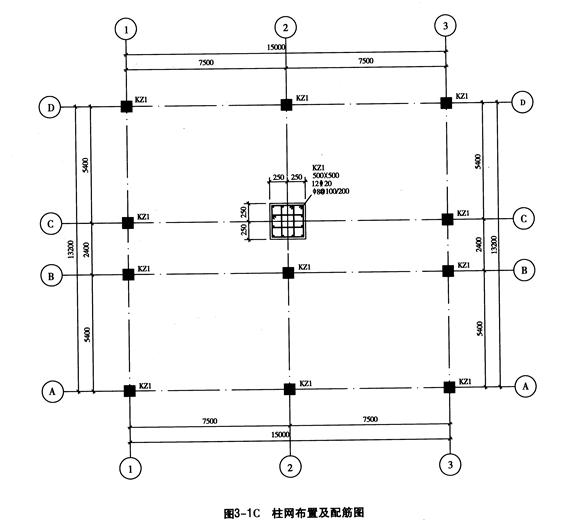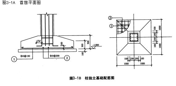 某鋼筋混凝土框架結構建筑物,共四層,首層層高4.2m,第二至四層層高分別為3.9m,首層平面圖、柱獨立基礎配筋圖、柱網布置及配筋圖、一層頂梁結構圖、一層 頂板結構圖如圖3-1A、圖3-1B、圖3-1C、圖3-1D、圖3-1E所示。柱頂的結構標高為15.87m,外墻為240mm厚加氣混凝土砌塊填充墻,首層墻體砌筑在頂面標高為-0. 20m的鋼筋混凝土基礎梁上,M5.0混合砂漿砌筑。 M1為1900mm×3300mm的鋁合金平開門;C1為2100mm×2400mm的鋁合金推拉窗;C2為1200mm×2400mm的鋁合金推拉窗;C3為1800mm×2400mm的鋁合金推拉窗;門窗詳見圖集L03J602;窗臺高900mmo門窗洞口上設鋼筋混凝土過梁,截面為240mm×180mm,過梁兩端各伸入砌體250mm。已知本工程抗震設防烈度為7度,抗震等級為四級(框架結構),梁、板、柱的混凝土均采用C30商品混凝土;鋼筋的保護層厚度:板為15mm,梁柱為25mm,基礎為35mm。樓板厚有150mm.lOOmm兩種。塊料地面的做法為:素水泥漿一遍,25mm厚1:3干硬性水泥砂漿結合層,800mm×800mm全瓷地面磚,白水泥砂漿擦縫。木質踢腳線高150mm,基層為9mm厚膠合板,面層為紅櫸木裝飾板,上口釘木線。柱面的裝飾做法為:木龍骨櫸木飾面包方柱,木龍骨為25mm×30mm,中距300mm×300mm,基層為9mm厚膠合板,面層為紅櫸木裝飾板。四周內墻面做法為:20mm厚1:2.5水泥砂漿抹面。天棚吊頂為輕鋼龍骨礦棉板平頂,U形輕鋼龍骨中距為450mm×450mm,面層為礦棉吸聲板,首層吊頂底標高為3.4m。