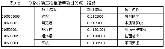 2.依據《房屋建筑與裝飾工程量計算規范》和《建設工程工程量清單計價規范》( GB50500-2013)(以下簡稱《計價規范》)編制建筑物首層的過梁、填充墻、矩形柱(框架柱)、矩形梁(框架梁)、平板、塊料地面、木質踢腳線、墻面抹灰、柱面(包括靠墻柱)裝飾、吊頂天棚的分部分項工程量清單,分部分項工程的統一編碼,見表3-2 。