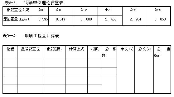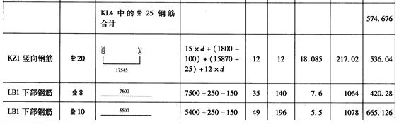 3.鋼筋的理論重量見表3-3,計算②軸線的KL4、⑥軸線相交于②軸線的KZ1中除了箍筋、腰筋、拉筋之外的其他鋼筋工程量以及①~②與④~⑤之間的LB1中底部鋼筋的工程量。將計算過程及結果填人鋼筋工程量計算表3-4中。鋼筋的錨固長度為40d,鋼筋接頭為對頭焊接。