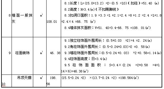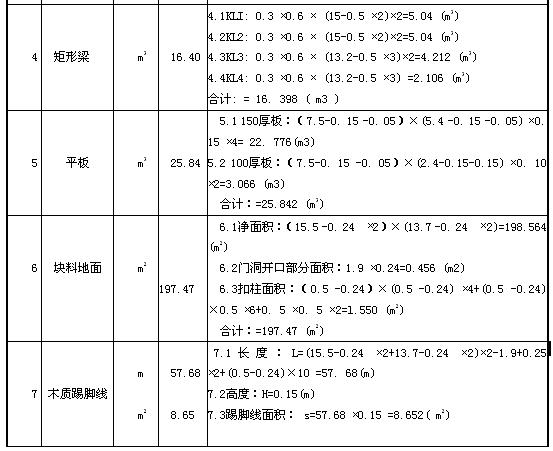 解:依據《房屋建筑與裝飾工程量計算規范》計算建筑物首層的過梁、填充墻、矩形柱(框架柱)、矩形梁(框架梁)、平板、塊料地面、木質踢腳線、墻面抹灰、柱面(包括靠墻柱)裝飾、吊頂天棚的工程量,計算過程見表3-5。