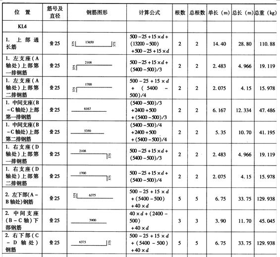 解:計算2軸線的KIA、⑥軸線相交于②軸線的KZ1中除了箍筋、腰筋、拉筋之外的其他鋼筋工程量以及LB1中的底部鋼筋的工程量。將計算結果填入鋼筋工程量計算表中,見表3-7。