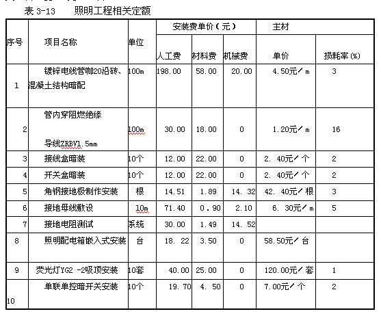1.某電話機房照明系統(tǒng)中一回路,如圖3-2所示。該照明工程相關定額規(guī)定,見表3-13。人工日工資50元/工日。