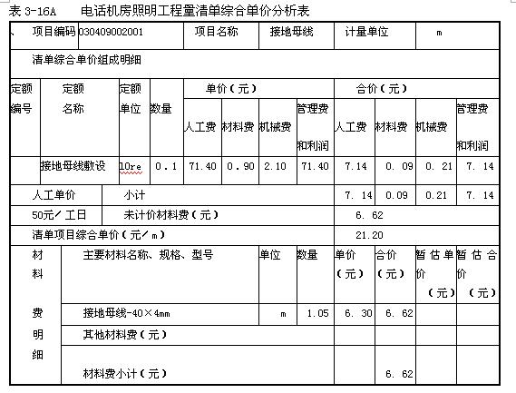 2.根據(jù)上述相關定額(表3-13)和《計價規(guī)范》的要求,計算接地母線、電氣配管和電氣配線分項工程的工程量清單綜合單價。