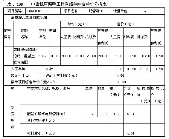 計算電氣配管綜合單價時,Φ20鍍鋅電線管主材數(shù)量應考慮表3-13中的損耗為3%;該電氣配管分項工程每米所含主材數(shù)量:4,20鍍鋅電線管主材1.03m。