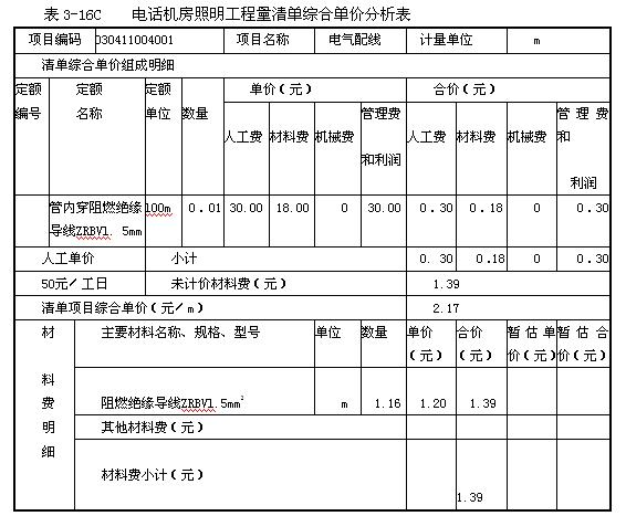 編制電話機房電氣照明工程分部分項工程量清單與計價表,見表3-17。