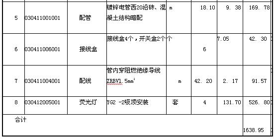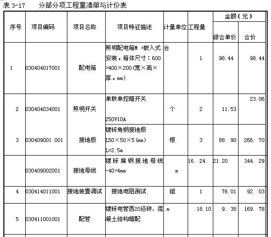 表3-17中,配電箱、照明開關、接地裝置調試、接線盒和熒光燈綜合單價根據(jù)表3-13中的數(shù)據(jù)計算,計算式為: