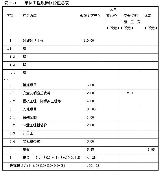 該單位工程投標(biāo)報(bào)價(jià)匯總表,見(jiàn)表3-21。