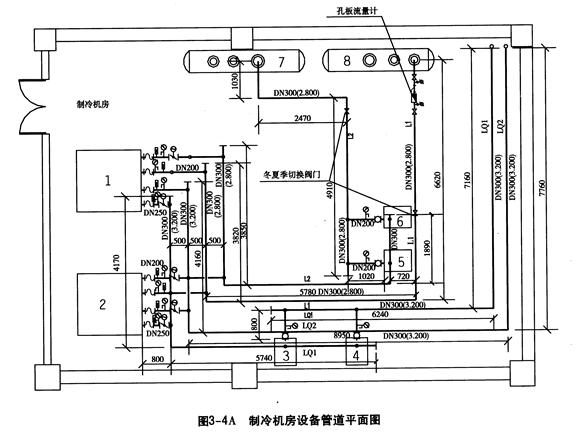 1.某制冷機房設備管道平面圖、系統圖,如圖3-4A、圖3-4B所示。