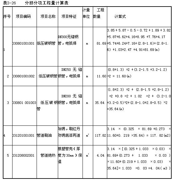 解:列表計算工程量,無縫鋼管工程量計算過程,見表3-260
