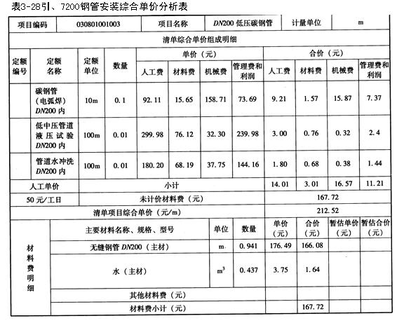 1.編制無縫鋼管DN200分項工程的工程量清單綜合單價分析表,見表3-28 。