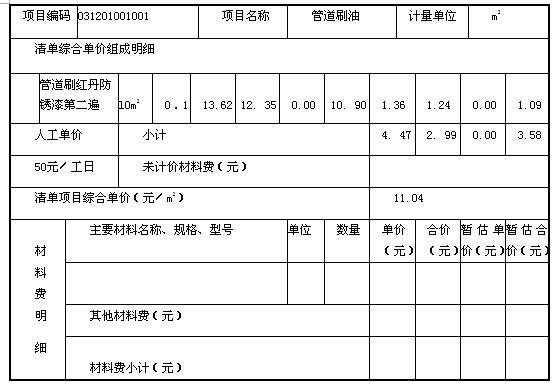 計算綜合單價時,應考慮每米管道無縫鋼管主材的消耗量0. 941m,綜合單價中包括管道水沖洗和液壓試驗的費用。