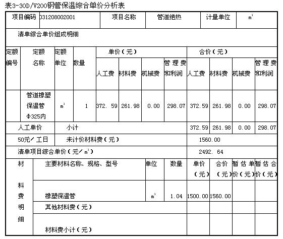 3.編制無縫鋼管DN200保溫的工程量清單綜合單價分析表,見表3-30。