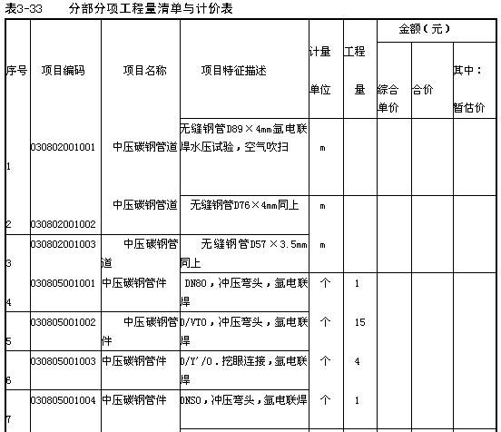 2.根據《通用安裝工程量計算規范》和《計價規范》的規定,計算管道D89×4、管道D76×4、管道D57×3.5、管架制作安裝、焊縫 ×光射線探傷、焊縫超聲波探傷六項工程量,并寫出計算過程。編列出該管道系統(注:閥門、法蘭安裝除外)的分部分項工程量清單與計價項目,將計算結果填人分部分項工程量清單與計價表中,見表3-33。