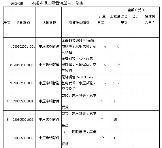 編列出該管道系統(注:閥門、法蘭安裝除外)的分部分項工程量清單與計價表的項目,將工程量計算結果填人分部分項工程量清單與計價表表3-33中,得表3-35。其計算過程寫在表3-35的下面。
