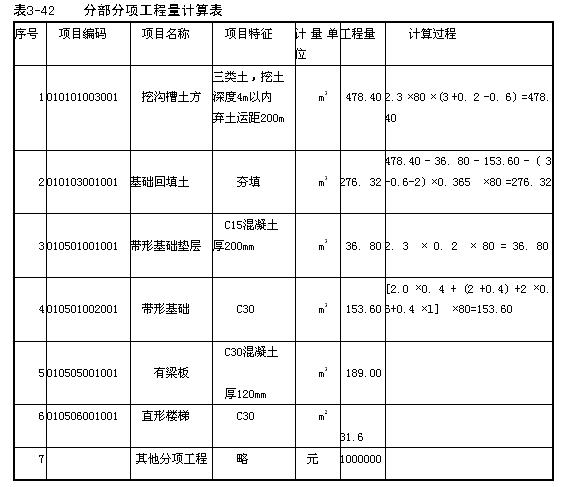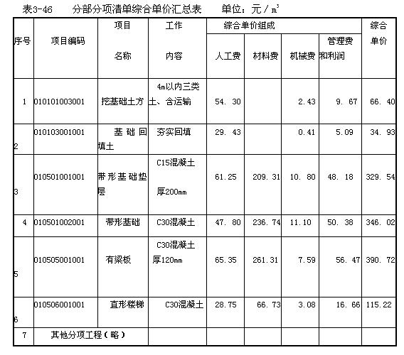 (4)帶形基礎墊層、有梁板和直形樓梯綜合單價的組成,采用與帶形基礎相同的計算方法(計算過程略,數值見表3-46)。