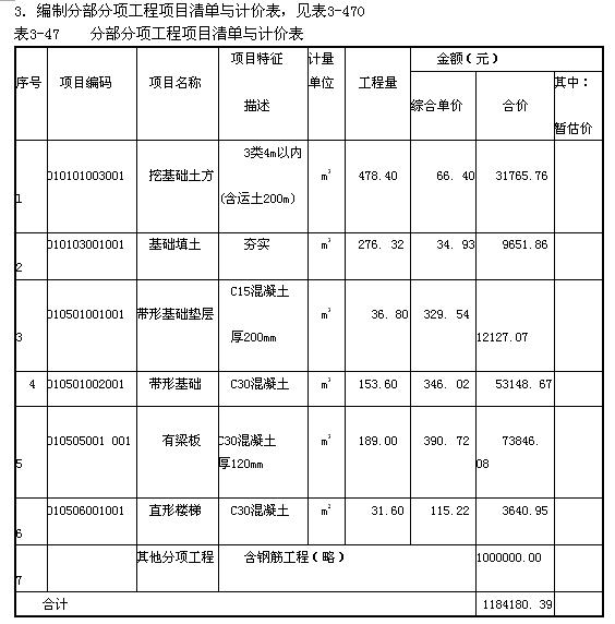 最后,編制該工程的分部分項工程量清單與計價表,見表3-47。