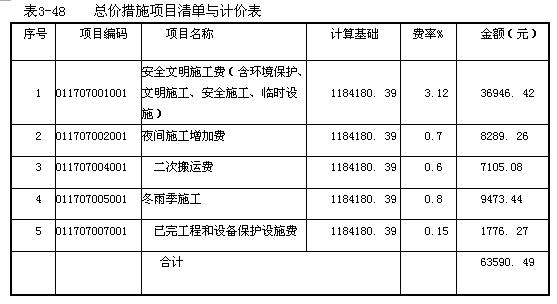1.措施項目中的通用項目參照《清單計價規范》選擇列項,還可以根據工程實際情況補充,總價措施項目清單與計價表,見表3-48。