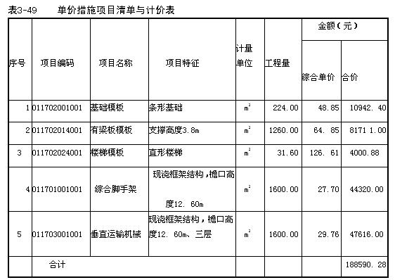 2.措施項目中可以計算工程量的項目,宜采用分部分項工程量清單與計價表的方式編制,單價措施項目清單與計價表,見表3-49。
