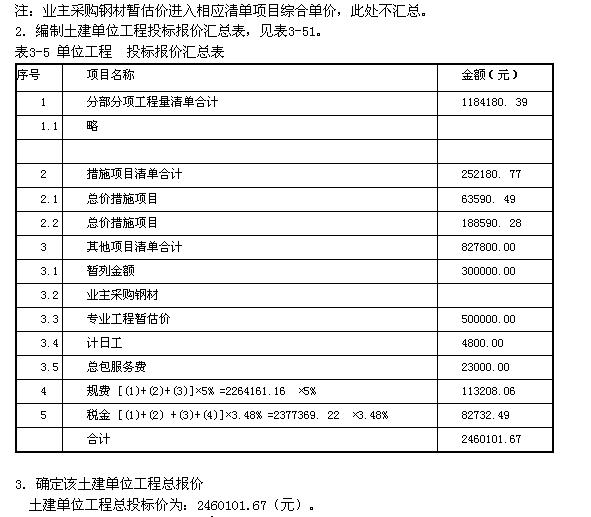 5.其他項目清單與計價匯總表中明確:暫列金額300000元,業主采購鋼材暫估價300000元(總包服務費按1%計取)。專業工程暫估價500000元(總包服務費按4%計取),計日工中暫估60個工日,單價為80元/工日。編制其他項目清單與計價匯總表;若現行規費與稅金分別按5%、3.48%計取,編制單位工程投標報價匯總表。確定該土建單位工程的投標報價。