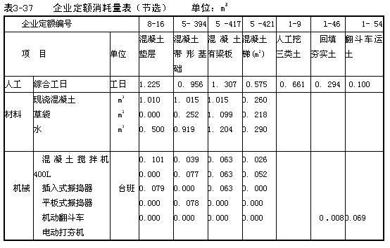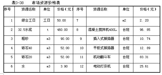 解:根據企業定額消耗量表3-37、市場資源價格表3-38和《全國統一建筑工程基礎定額》混凝土配合比表3-39,編制該工程分部分項工程量清單綜合單價表和分部分項工程量清單與計價表。