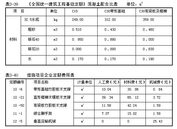 3.根據企業定額消耗量表3-37、市場資源價格表3-38和《全國統一建筑工程基礎定額》混凝土配合比表3-39,模板費用放在措施項目費用中,編制該工程分部分項工程量清單綜合單價表和分部分項工程量清單與計價表。