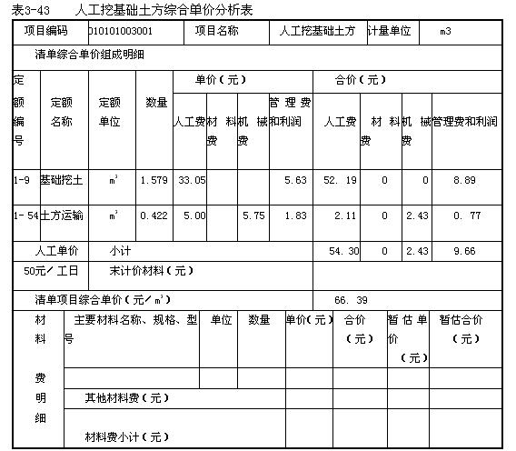 (1)人工挖基礎土方綜合單價分析表,見表3-43。
