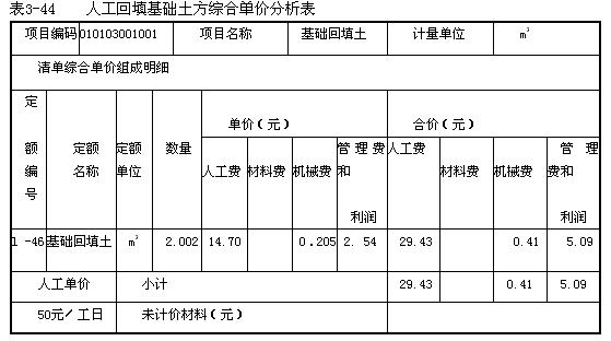 (2)基礎回填土綜合單價分析表,見表3-44。
