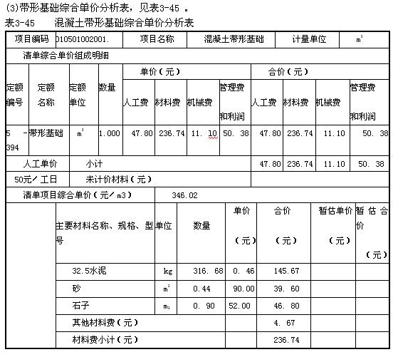 首先,編制綜合性分項工程的綜合單價分析表,如人工挖基礎土方、基礎回填土、混凝土帶形基礎等分部分項工程的綜合單價分析表,見表3-43~表3-45。