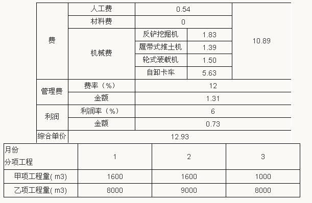 (1)分項工程清單中含有兩個分項工程,工程量分別為甲項4500m3,乙項31 000m3,清單報價中,甲項綜合單價為200元/m3,乙項綜合單價為l2.93元/m3,乙項綜合單價的單價分析表見表5.1.當某一分項工程實際工程量比清單工程量增加超出10%時,應調整單價,超出部分的單價調整系數為0.9;當某一分項工程實際工程量比清單工程量減少10%以上時,對該分項工程的全部工程量調整單價,單價調整系數為1.1.(2)措施項目清單共有7個項目,其中環境保護等3項措施費用4.5萬元,這3項措施費用以分部分項工程量清單計價合計為基數進行結算。剩余的4項措施費用共計l6萬元,一次性包死,不得調價。全部措施項目費在開工后的第1個月末和第2個月末按措施項目清單中的數額分兩次平均支付,環境保護措施等3項費用調整部分在最后一個月結清,多退少補。