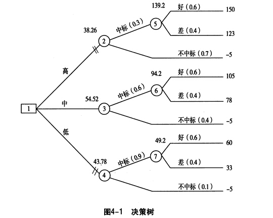 2.畫出決策樹,標(biāo)明各方案的概率和利潤,如圖4-1所示。